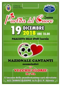 BENEFICENZA – Si è terrà oggi pomeriggio alle ore 18, nel Palazzetto dello Sport di Isernia, la “Partita del Cuore”, incontro di calcio che vedrà come protagoniste la Nazionale Cantanti Napoletani e le Vecchie Glorie dell’Isernia e del Napoli. L’incasso della manifestazione sarà devoluto all’Associazione A.Fa.S.E.V. di Isernia.