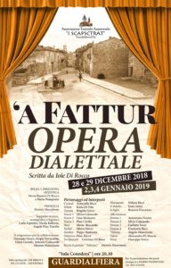 La Compagnia, che di amatoriale ha ben poco, visti la passione ed i risultati di assoluto livello artistico raggiunti, ha portato in scena l’opera dialettale “A Fattur” di Iole Di Rocco, autrice di tutte le altre opere proposte dal 2011 ad oggi. La drammaticità e l’intensità del testo, che ripropone uno spaccato di vita familiare di povera gente degli anni Trenta, hanno dato modo agli interpreti di farsi apprezzare in modo completo, suscitando emozioni ed autentica partecipazione da parte del pubblico che non ha mancato di apprezzare con entusiasmo la performance.