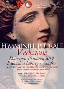 CULTURA – Con il patrocinio del Comune di Venafro e in collaborazione con i Borghi della Lettura e la Cooperativa sociale Il Geco, EtCetera presenta la quinta edizione di “Femminile Plurale”, la kermesse che celebra l’universo femminile senza cedere alla retorica dei luoghi comuni.
