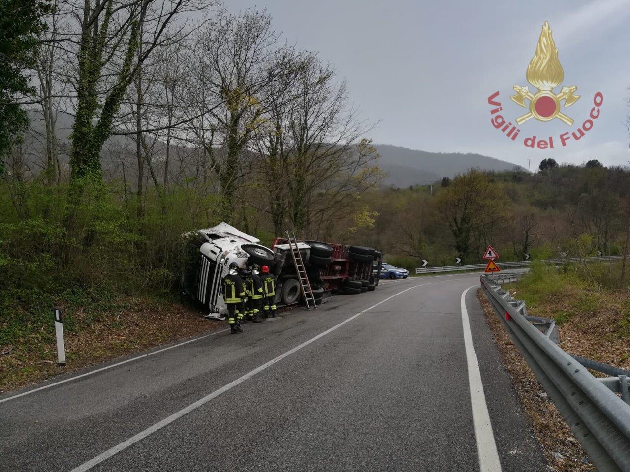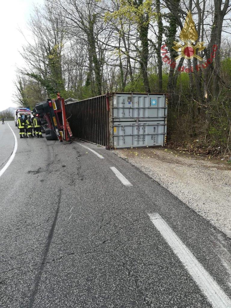 Tir e container si sono abbattuti sul lato destro della carreggiata in una curva al km 33,250 a pochi metri dal bivio di Montaquila.