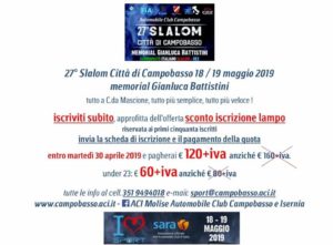 Negli uffici dell’ACI Campobasso sono già aperte le iscrizioni, previsto uno sconto per le prime cinquanta adesioni, regolamento e modulistica sono consultabili sul sito: www.campobasso.aci.it e sulla pagina Facebook “Aci Molise Automobile Club Campobasso e Isernia”.