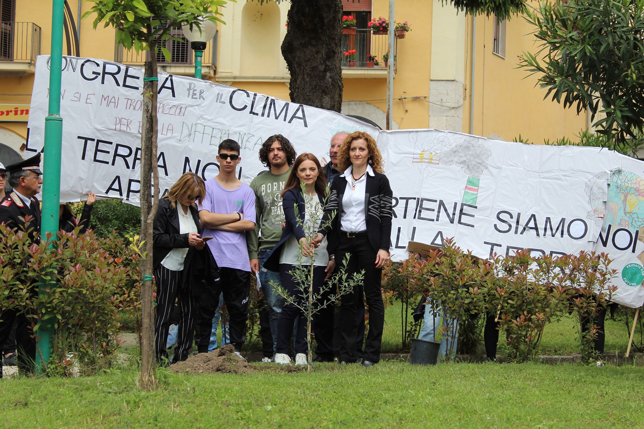 Ad aprire il corteo, partito dalla sede di via Maiella e terminato su corso Lucenteforte dove è stata messa a dimora una pianta di ulivo, un grosso cartellone che recava la scritta “La Terra non ci appartiene, siamo noi che apparteniamo alla Terra“.