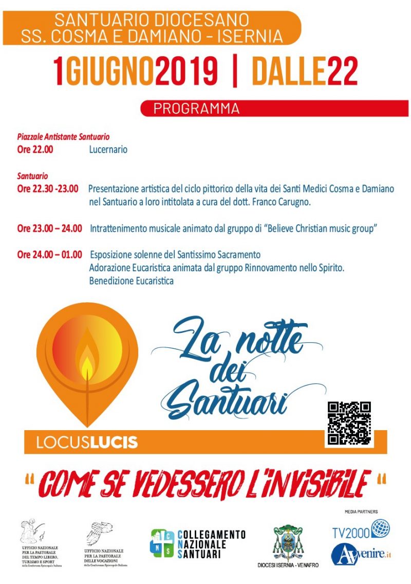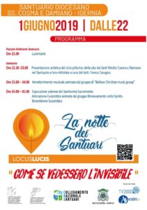 La diocesi di Isernia-Venafro ha organizzato una serata culturale/spirituale che si terrà al Santuario Diocesano Eremo dei ss. Cosma e Damiano di Isernia a partire dalle ore 22,00 di sabato 1 giugno.