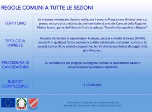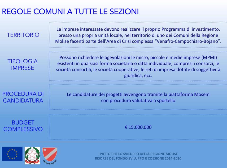 Ovviamente gli investimenti devono ricadere nell’area riconosciuta dal Governo appartenente all’asse industriale Venafro Bojano Campobasso e a beneficiarne potranno essere, secondo quanto recita il Decreto dello stesso Governo centrale, imprese individuali consorziate, cvcoperative etc.