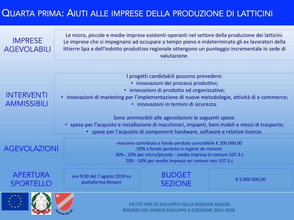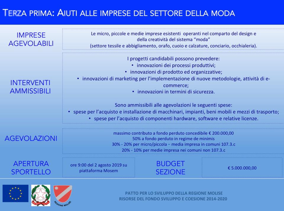 Le attribuzioni finanziarie sono indirizzati attraverso 4 Bandi a processi innovativi acquisti di macchinari marketing assunzioni di personale anche e soprattutto da altre entità produttive sparite dal panorama tessile e saranno di due milioni di euro per il commercio e altrettanti per l’artigianato 5 milioni di euro per il settore moda e quindi tessile con premialità maggori per chi si caricherà dell’esperienza della conoscenza e professionalità dei dipendenti della ex Ittierre e altrettanti cinque milioni nel Bando a sostegno dell’area casearia. Sono ammissibili richieste a fondo perduto fino a circa 200 mila euro.