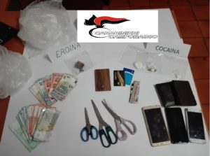 Bilancini di precisione, cellophane, forbici, unitamente a denaro contante (circa 700 euro), provento dell’attività di spaccio ed ovviamente sostanze stupefacenti del tipo eroina, per un totale di 30 gr., nonché cocaina, questa già suddivisa in dosi e pronta allo smercio, per un totale di 10 gr..