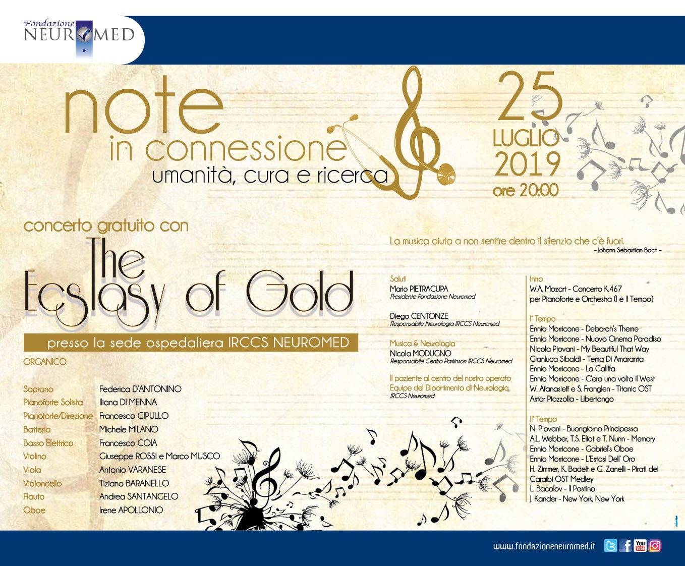 Il concerto è aperto a tutti ed è gratuito. Il gruppo “The Ecstasy of Gold” eseguirà musiche di Mozart, Ennio Morricone, Nicola Piovani, Gianluca Sibaldi e altri. Un concerto di musica classica e di colonne sonore dei film più belli dell’ultimo secolo per scoprire la bellezza e l’importanza della musica anche nella vita quotidiana.