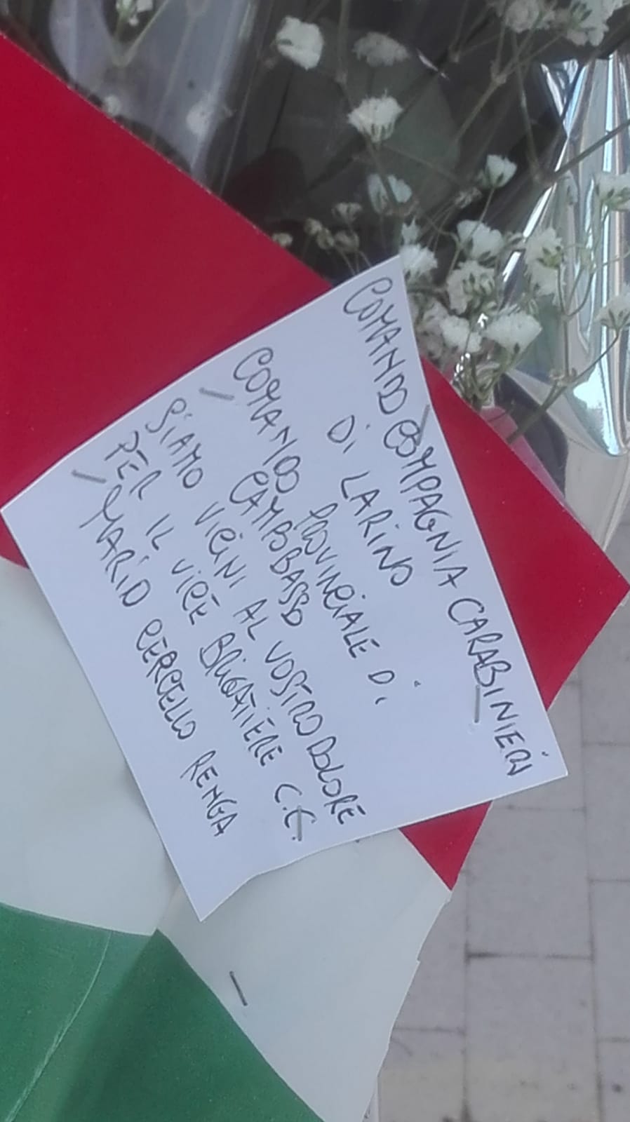 Sul biglietto è stato scritto: “SIAMO VICINI AL VOSTRO DOLORE PER IL VICE BRIGADIERE CC. MARIO CERCELLO RENGA”