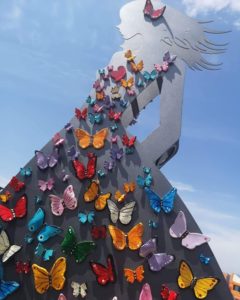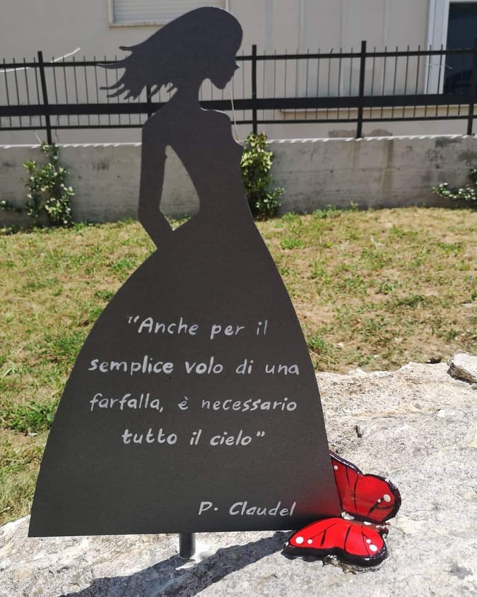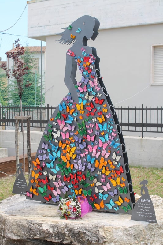 Una struttura in ferro che rappresenta una figura di donna, adornata da tante farfalle colorate in ceramica, dipinte a mano dai ragazzi si erge nella piazza antistante la scuola elementare. Ai piedi del monumento una piccola riproduzione dell’opera, con una dedica a tutta la popolazione, un messaggio di speranza dettato dalle parole dello scrittore francese Paul Claudel: “Anche per il semplice volo della farfalla è necessario tutto il cielo”.