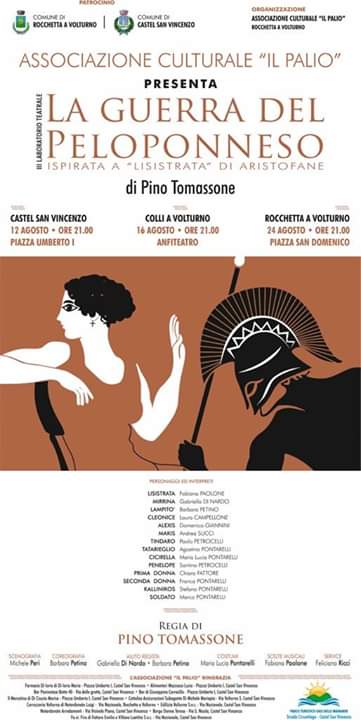 ROCCHETTA A VOLTURNO – Sabato 24 Agosto a Rocchetta a Volturno, in Piazza San Domenico, l’Associazione “Il Palio” presieduta da Marialucia Pontarelli presenta la commedia “La Guerra del Peloponneso” di Pino Tomassone, tratta da “Lisistrata” di Aristofane.
