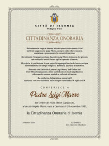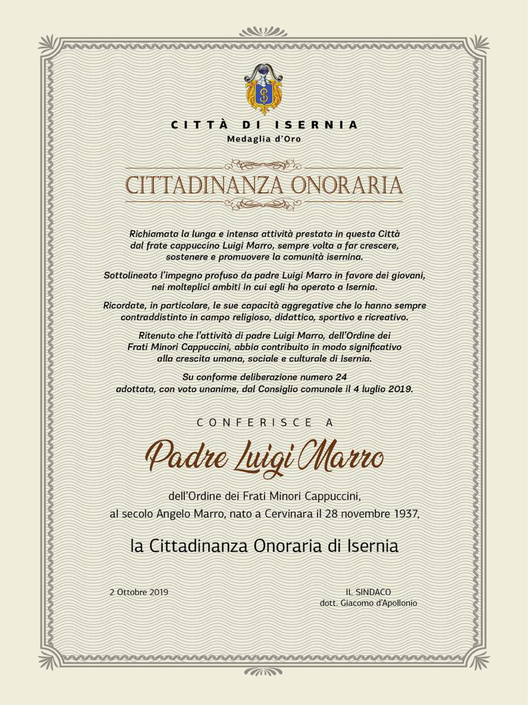 ISERNIA – Si è tenuta questa mattina a Palazzo San Francesco alla presenza delle autorità la cerimonia di conferimento della cittadinanza onoraria a Padre Luigi Marro.