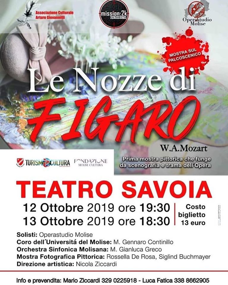 Dopo il grande successo a Oratino ritorna, il 12 e 13 ottobre, il doppio appuntamento con Le Nozze di Figaro. Questa volta, però, l’opera lirica si svolgerà presso il teatro Savoia di Campobasso. La regia e la direzione artistica dell’evento, organizzato dall’Associazione Culturale “Arturo Giovannitti”, è stata affidata al baritono Nicola Ziccardi. Sul palco i solisti dell’Operastudio Molise, il Coro dell’Università del Molise, diretto dal Maestro Gennaro Continillo e l’Orchestra Sinfonica Molisana, diretta dal Maestro Gianluca Greco. Nei panni di Figaro il talentuoso Francesco Bossi. Lo spettacolo sarà impreziosito dalla prima mostra pittorica che fungerà da scenografia e trama dell’Opera. Rassegna artistica curata da Rossella De Rosa e Siglind Buchmayer.