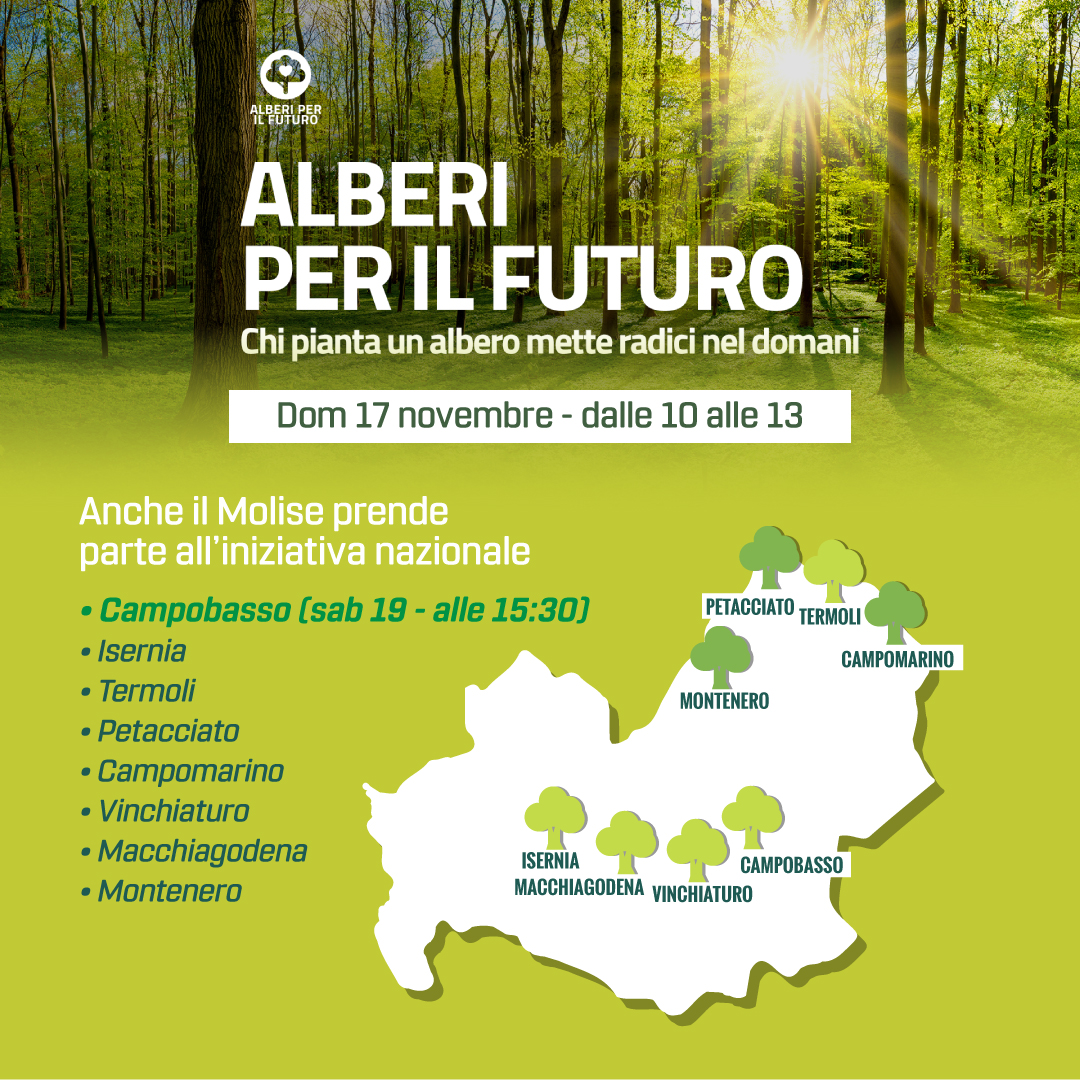MOLISE – Sabato 16 e domenica 17 novembre in decine di comuni italiani è in programma la quinta edizione di “Alberi per il futuro“, la due giorni di festa e piantumazione che, in concomitanza con la Giornata nazionale degli alberi, coinvolge portavoce e cittadini, per ricordare che la tutela dell’ambiente è un dovere di tutti.