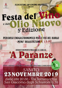 SAN GIACOMO degli SCHIAVONI – “Festa del Vino e dell’Olio Nuovo”:  al via sabato 23 novembre la V edizione organizzata dall’Associazione San Giacomo Unicamente e patrocinata dal comune di San Giacomo.
