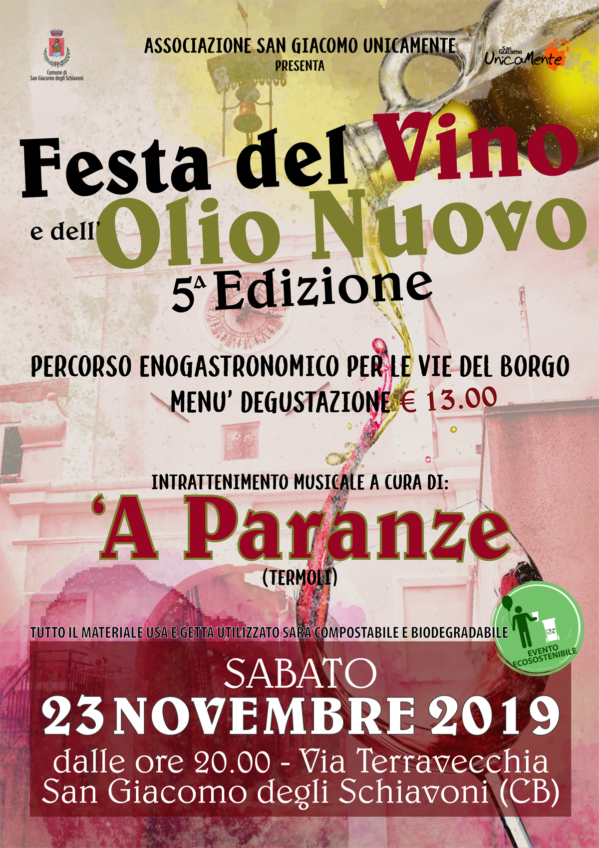 A partire dalle ore 20.00 nel Borgo Vecchio di San Giacomo degli Schiavoni si snoderà il percorso enogastronomico nel quale si potrà degustare l’olio sangiacomese 2019 e dell’ottimo vino proveniente dalla vendemmia 2019, ed assaggiare piatti e prodotti tipici del paese.