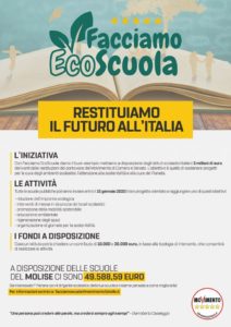 “Tutte le scuole pubbliche, anche quelle molisane – continua la Portavoce – entro il 15 gennaio 2020 potranno presentare un progetto scegliendo tra 6 diversi obiettivi: riduzione dell’impronta ecologica, interventi di messa in sicurezza degli edifici scolastici, mobilità sostenibile, educazione ambientale, rigenerazione degli spazi scolastici e il recupero di aree verdi, giochi e piazze del proprio quartiere. Ogni progetto verrà poi votato dagli iscritti al MoVimento 5 Stelle su base regionale. Le risorse disponibili per il Molise ammontano a 49.588,59 euro”.