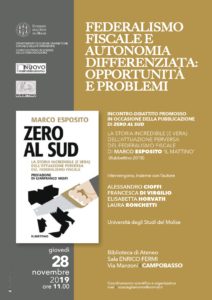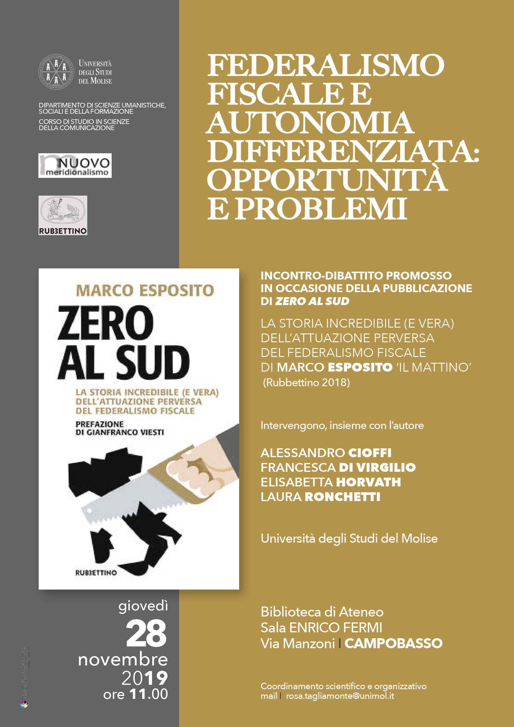 CAMPOBASSO – Il Dipartimento di Scienze Umanistiche, Sociali e della Formazione, Corso di studio in Scienze della comunicazione in collaborazione con la Rivista interdisciplinare Nuovo Meridionalismo Studi e con l’editore Rubbettino, ha inteso organizzare un incontro-dibattito promosso in occasione della pubblicazione di Zero al Sud.