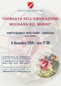 CAMPOBASSO – La “Giornata dell’emigrazione molisana nel Mondo” avrà luogo il 6 dicembre alle ore 17.30 presso l’Aula magna del Convitto Nazionale “Mario Pagano” di Campobasso.