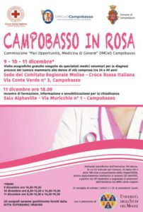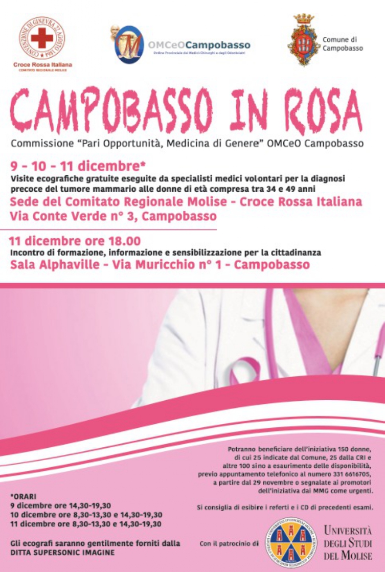 CAMPOBASSO – L’Ordine dei Medici Chirurghi e degli Odontoiatri della Provincia di Campobasso, con la sua Commissione “Pari Opportunità, Medicina di Genere”, promuove nei giorni 9, 10 e 11 dicembre 2019 l’iniziativa “CAMPOBASSO IN ROSA”: visite ecografiche gratuite, formazione, informazione e sensibilizzazione per la diagnosi precoce del tumore mammario alle donne di età compresa tra 34 e 49 anni, che non rientrano nei controlli regionali.