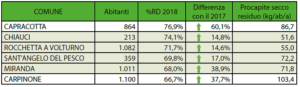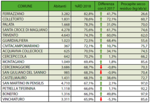 La percentuale regionale di raccolta differenziata è pari al 38,4%, in leggero aumento rispetto allo scorso anno ma ancora troppo bassa rispetto a quanto richiesto dalla normativa. La produzione pro-capite di rifiuti indifferenziati nel 2018 è stata pari a 234,6 kg/ab. Per alcuni comuni va segnalata una discordanza tra i dati presenti nella piattaforma dell’ARPA e quanto indicato dall’ISPRA. Chiediamo alle amministrazioni comunali di fare attenzione nella compilazione dei MUD in maniera tale da permettere a tutti di avere un quadro più preciso. In Molise, sono 23 i comuni che superano la soglia del 65% di raccolta differenziata nel 2018, in aumento rispetto al 2017, anno in cui erano solo 11. Di questi comuni, 11 della provincia di Campobasso e 4 di quella di Isernia sono stati insigniti della qualifica “Rifiuti Free”, essendo riusciti a ridurre il residuo secco indifferenziato sotto ai 75 kg per abitante/anno. Fanno fatica soprattutto le città, le quali non riescono ad attuare politiche idonee per una corretta gestione della raccolta differenziata. Campobasso nel 2018 è riuscita a raggiungere una soglia pari al 22,1%, crescendo rispetto ai dati 2017, ma ancora troppo poco per una città che sfiora i 50mila abitanti. Isernia arriva al 57,3%, Termoli al 37,9% e Venafro al 16,4%, dati non sufficienti non solo per entrare nella classifica Comuni Ricicloni, ma soprattutto che non rispettano i limiti imposti dalla legge.