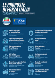 Le proposte di Forza Italia prevedono una serie di interventi di vario genere in settori considerati chiave per l’economia italiana. Da una maggiore flessibilità nel lavoro a meno tasse; dalle misure per sostenere lo sviluppo a quelle previste per la scuola, la cultura, l’istruzione e il turismo; dal rilancio delle attività produttive agli interventi per la tutela degli agricoltori. Il tutto, ovviamente, in una cornice europea in cui Forza Italia chiede di rivedere alcuni fondamentali parametri economici per poter avere a disposizione tutte le risorse necessarie per affrontare al meglio l’emergenza sanitaria e quella economica.