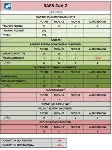 I pazienti positivi isolati a domicilio sono 30: 21 asintomatici e 9 dimessi asintomatici. In isolamento ci sono 195 persone, mentre i soggetti in sorveglianza sono 160.