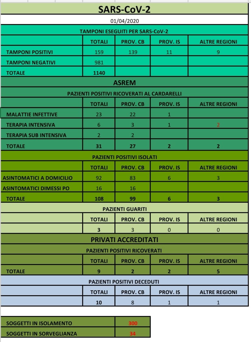 REGIONE MOLISE - Il bollettino ufficiale del 1 aprile 2020 delle ore 18,00.