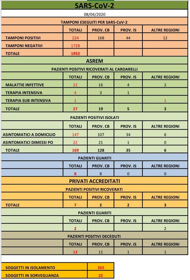REGIONE MOLISE – Il bollettino ufficiale del 8 aprile 2020 delle ore 18,00.