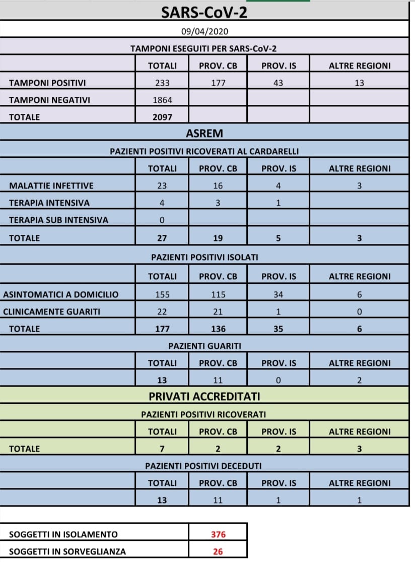REGIONE MOLISE – Il bollettino ufficiale del 9 aprile 2020 delle ore 18,00.