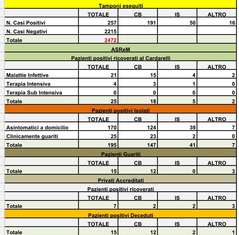 Infine, sono 15 i pazienti deceduti. 12 della provincia di Campobasso, 2 della provincia di Isernia e 1 di altra regione.