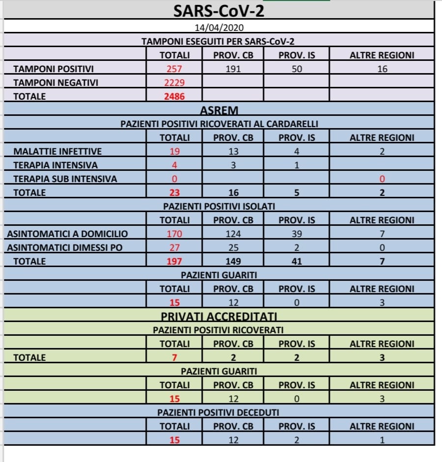 CAMPOBASSO – L’Asrem ha diramato il bollettino dei contagi della mattinata di martedì 14 aprile.