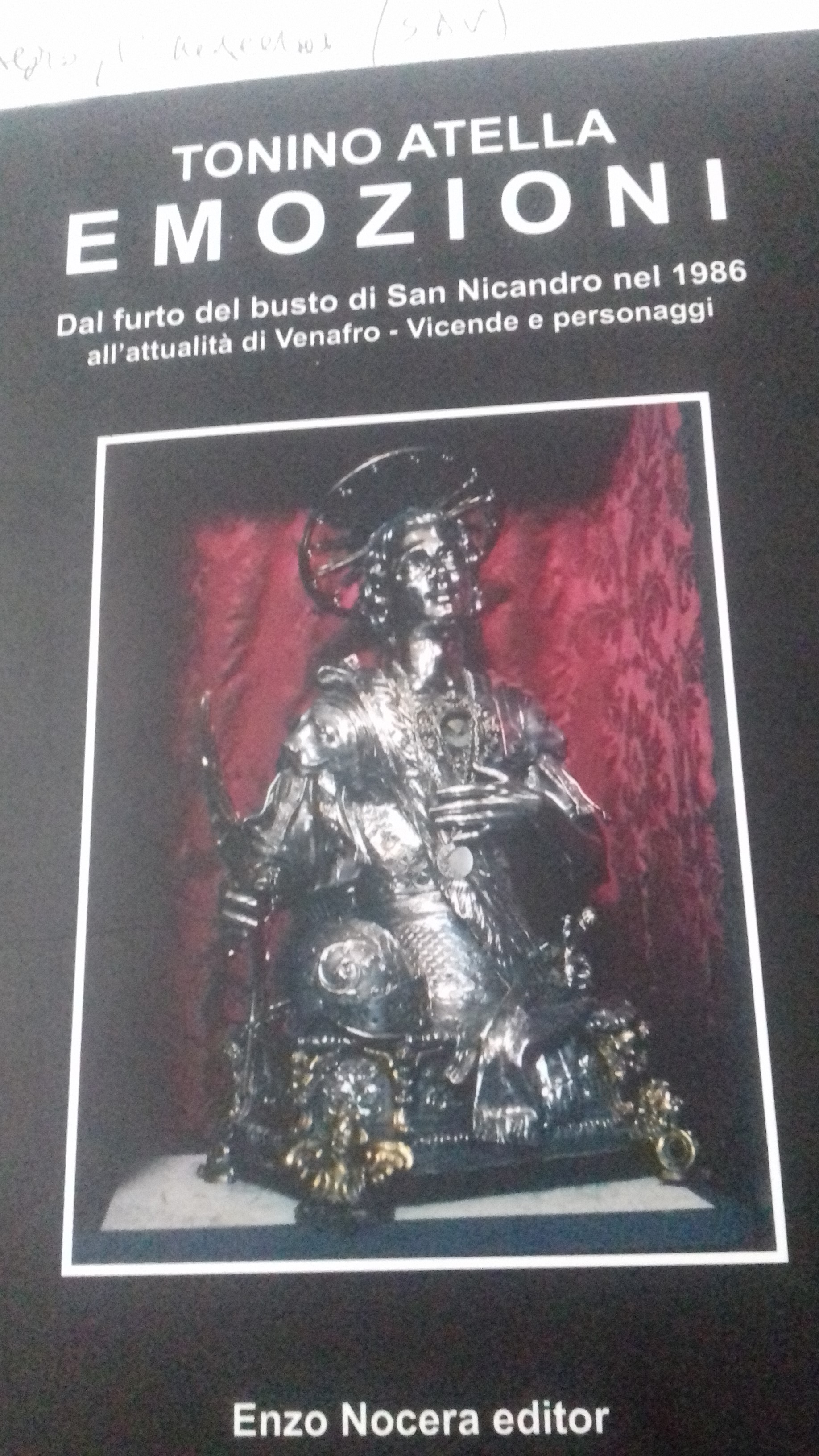 “Nel testo dalla magnifica copertina nera -spiega lo scrittore- su cui campeggia la suggestiva immagine dell’originale busto di San Nicandro, splendida opera della Scuola Orafa Napoletana del ’600, rubato da mani ignote dalla sacrestia della Chiesa di Cristo nel cuore del centro storico venafrano nel giugno 1986 all’indomani delle partecipatissime feste patronali venafrane di quell’anno e mai più ritrovato, in tale testo -afferma Atella- c’è tanto di Enzo Nocera, che si dedicò moltissimo per la riuscita editoriale del lavoro. Lui stesso volle offrire buona parte delle foto presenti nel libro, a partire appunto da quella in copertina. E fu lo stesso Enzo a suggerire la copertina di color nero, in quanto a suo parere ben si addiceva al contenuto del testo, ossia le emozioni dei venafrani scaturite dal furto del busto di San Nicandro nel 1986 e l’attualità cittadina dell’epoca attraverso la particolarissima vicenda e i personaggi che ne divennero protagonisti. Aveva una ricca biblioteca fotografica e la mise a disposizione senza problemi di sorta. Curò personalmente anche l’impaginazione e la grafica, dedicandosi come fosse un proprio lavoro. Suggeriva, era ricco di consigli ed alla fine mi chiese di essere il moderatore della cerimonia di presentazione svoltasi nella Sala della Giustizia di Castello Pandone a Venafro gremita di pubblico, cosa che accettai ben volentieri”.