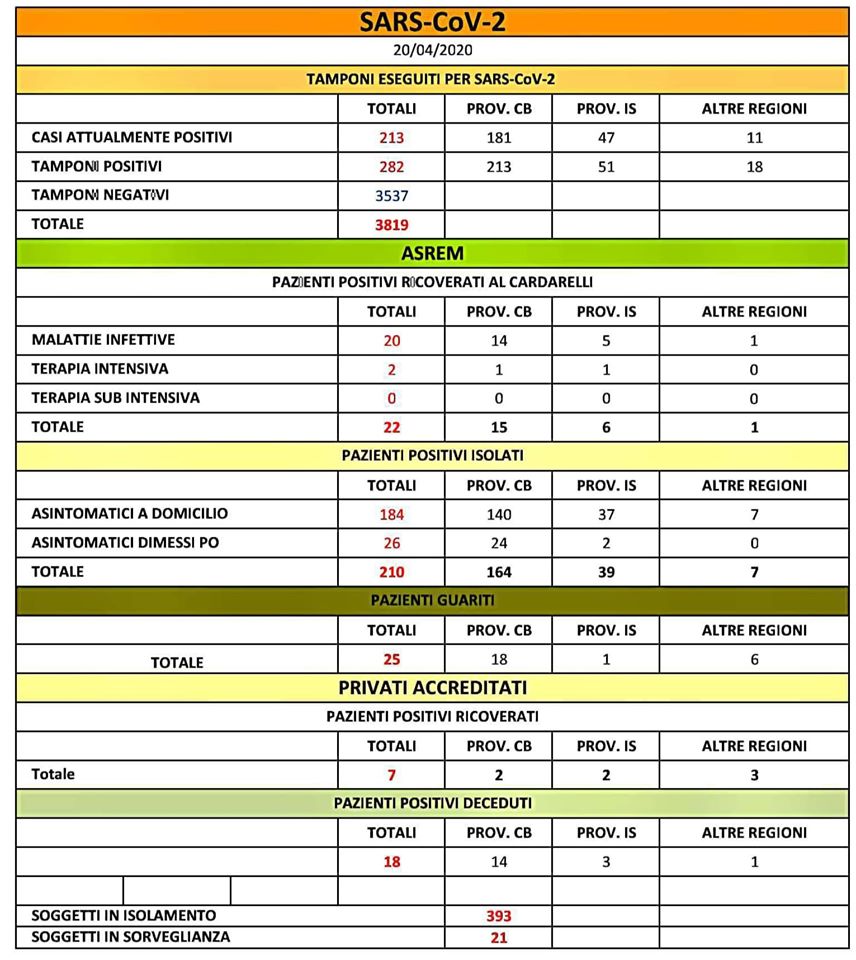 REGIONE MOLISE – Il bollettino ufficiale del 20 aprile 2020 delle ore 18,00.