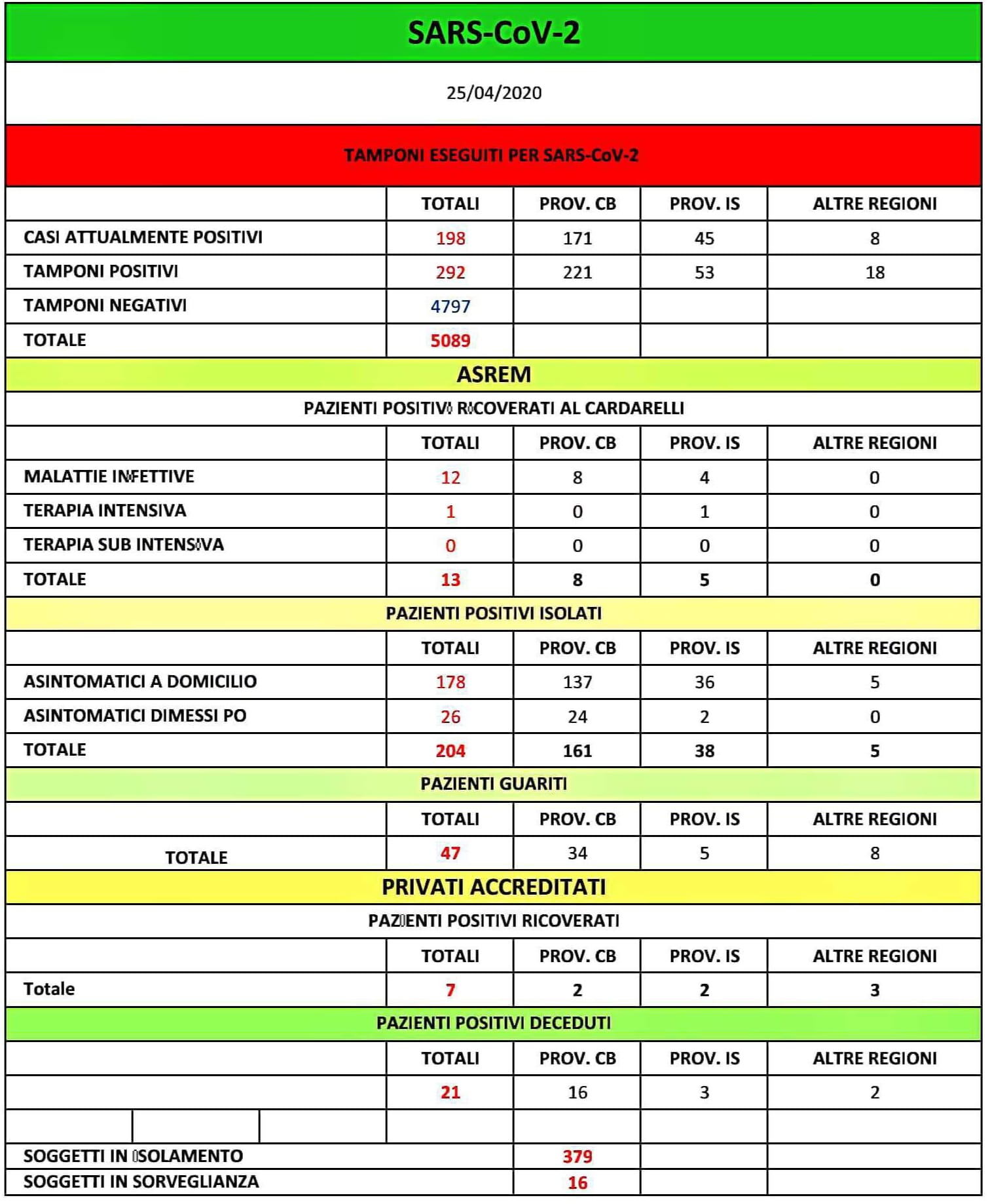 REGIONE MOLISE – Il bollettino ufficiale del 25 aprile 2020 delle ore 18,00.