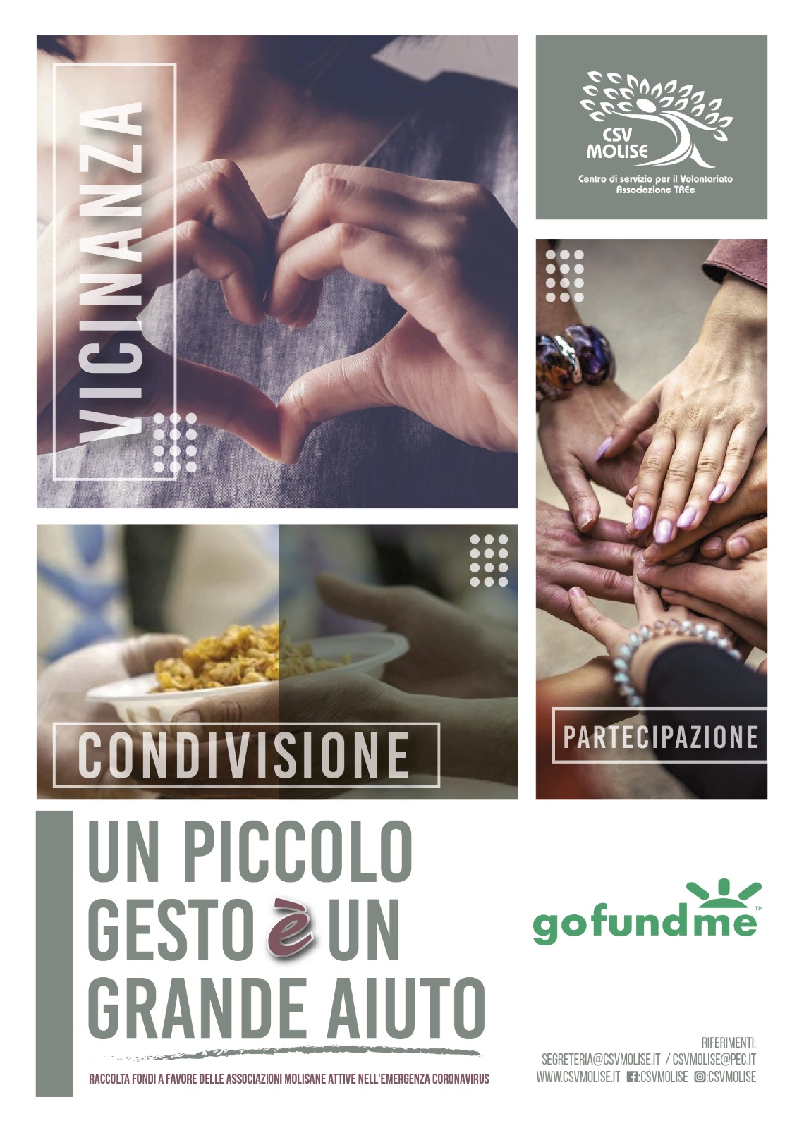 Il CSV Molise ha attivato ‘Un piccolo gesto è un grande aiuto’, con l’obiettivo di raggruppare una cifra da destinare alle associazioni che stanno operando in Molise nella lotta al Covid-19.