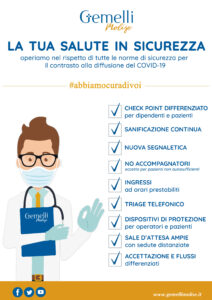 Al fine di tutelare la salute dei propri pazienti e dei propri dipendenti, Gemelli Molise ha adottato una serie di accorgimenti che garantiscono la totale sicurezza. In questi mesi l’ospedale è stato ridisegnato al fine di predisporre e garantire percorsi separati.