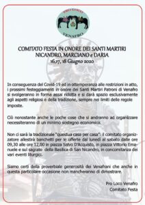 VENAFRO – Feste Patronali venafrane 2020, esattamente il 16, 17 e 18 giugno in onore dei Santi Martiri Nicandro, Marciano e Daria, in chiave ridotta causa covid.