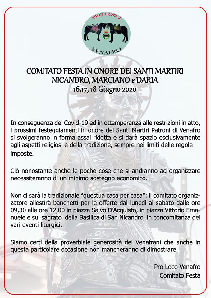 Ne dà informazione la Pro Loco, facendo sapere che ci saranno unicamente le processioni e pochi appuntamenti tradizionali tipici, date le restrizioni in atto per non alimentare contagi e pericoli. In conseguenza di ciò sempre la Pro Loco Venafro fa sapere che non ci sarà la tradizionale “questua” tra la popolazione per la raccolta delle offerte con cui si era soliti allestire i tre giorni di festeggiamenti religiosi e civili, ma per affrontare le spese necessarie solo banchetti dinanzi alla Basilica di San Nicandro e nelle piazze Vittorio Emanuele II e D’Acquisto per eventuali offerte da parte dei cittadini.