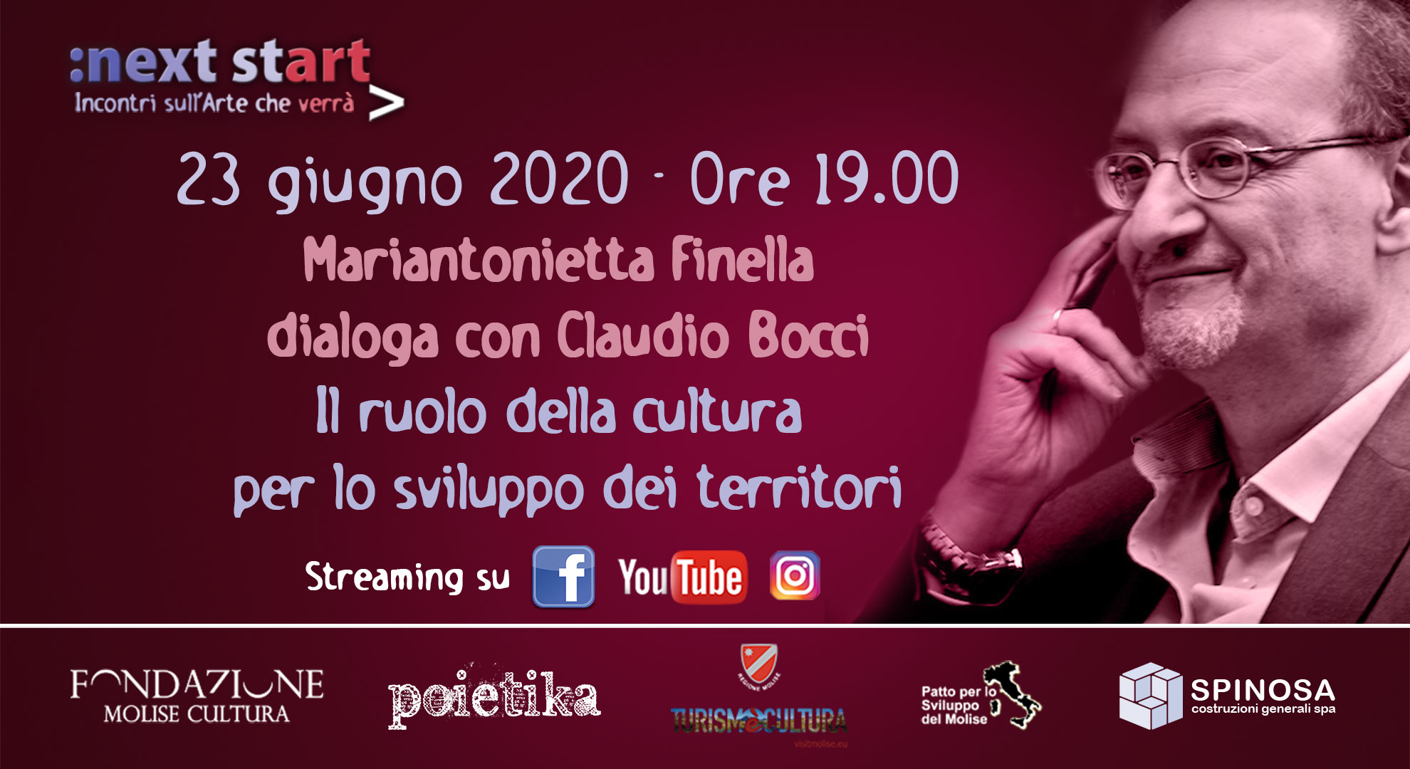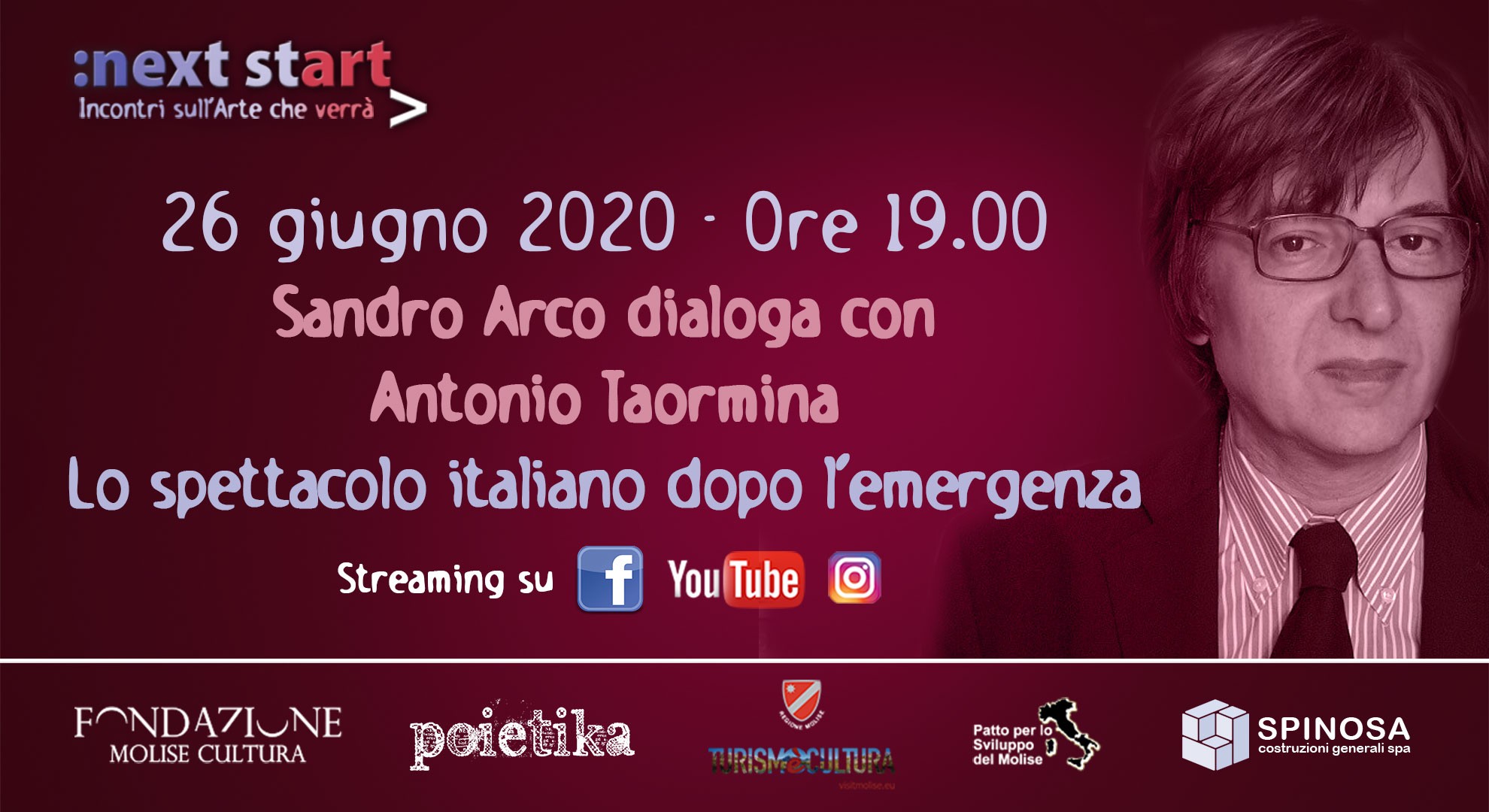 Si avvia alla chiusura la programmazione di Next StArt, il ciclo di conversazioni online di Poietika, la rassegna di Fondazione Molise Cultura e Regione Molise che sta utilizzando Facebook, Instagram e YouTube per una serie di dirette su temi culturali e artistici. Dopo il successo dell’edizione 2019 (tra i partecipanti Vandana Shiva, Wim Mertens, Raúl Zurita, Nedim Gürsel, Letizia Battaglia), Fondazione Molise Cultura ha fortemente sostenuto l’idea di una iniziativa social con autorevoli operatori del mondo della cultura, stimolando un loro contributo non solo nei rispettivi segmenti di pertinenza, ma anche alla luce di quanto sta accadendo e della trasformazione epocale che ci sta coinvolgendo dopo la pandemia.