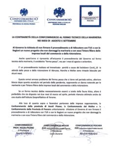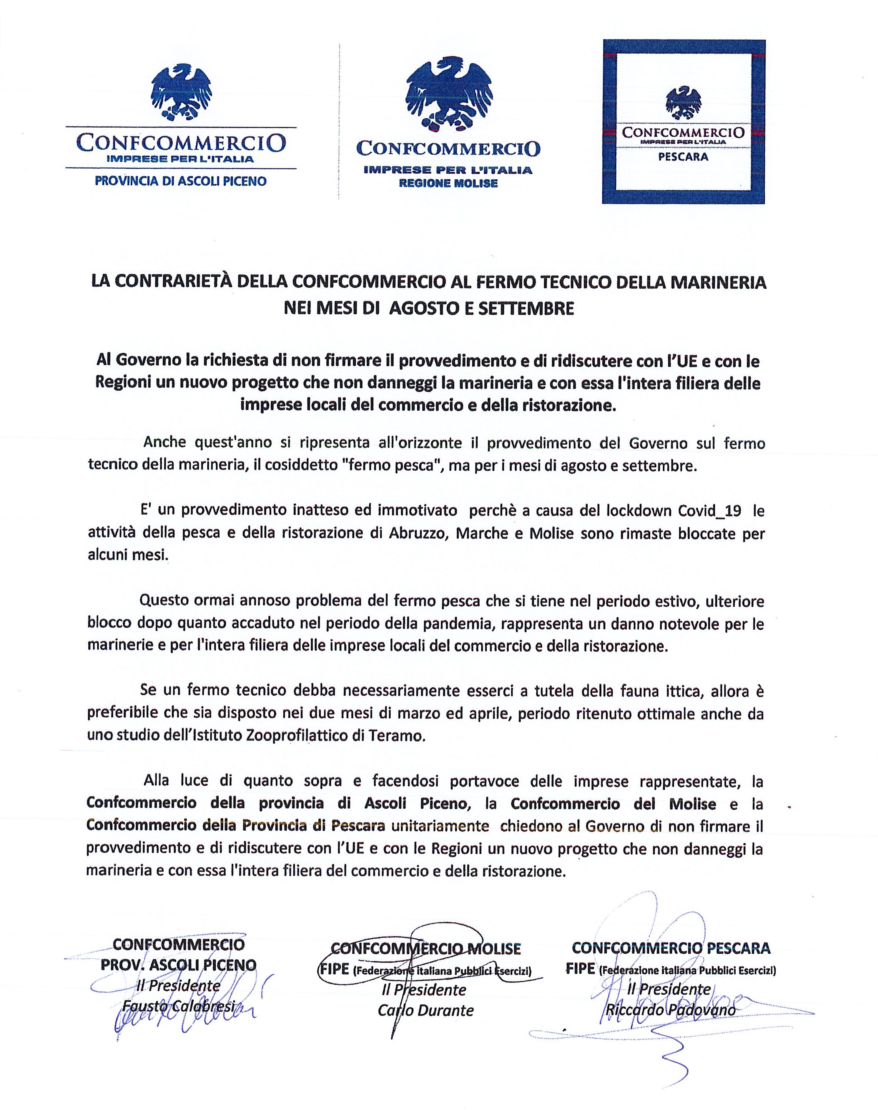 Alla luce di quanto sopra e facendosi portavoce delle imprese rappresentate, la Confcommercio della provincia di Ascoli Piceno, la Confcommercio del Molise e la Confcommercio della Provincia di Pescara unitariamente chiedono al Governo di non firmare il provvedimento e di ridiscutere con l’UE e con le Regioni un nuovo progetto che non danneggi la marineria e con essa l’intera filiera del commercio e della ristorazione.