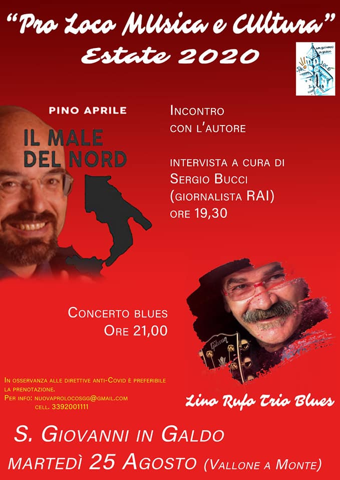 SAN GIOVANNI IN GALDO – Martedì 25 agosto, la nuova Proloco di San Giovanni in Galdo ospiterà, sul “parterre” del Vallone a Monte, lo scrittore Pino Aprile e il musicista e cantautore Lino Rufo accompagnato per l’occasione dai musicisti Pierpaolo Ranieri e Alberto Lombardi.