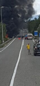 Un autoarticolato, che trasportava sabbia,  è finito fuori strada ribaltandosi nella scarpata per poi incendiarsi. Il conducente del mezzo pesante, un 42enne del salernitano, purtroppo è deceduto.