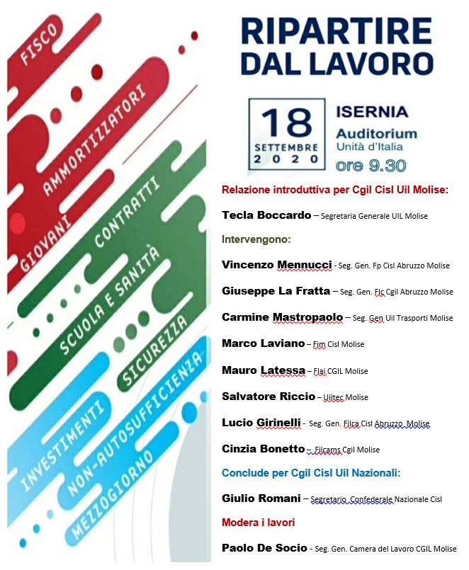 CAMPOBASSO – ‘Ripartire dal Lavoro’, con questo slogan prosegue la mobilitazione di Cgil, Cisl e Uil, dopo ‘La notte del Lavoro’ del 29 luglio scorso.