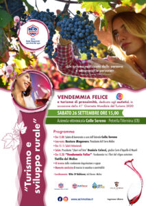 La Vendemmia Felice avrà luogo sabato 26 settembre, a partire dalle ore 15:00, presso l’Azienda Vitivinicola Colle Sereno in agro di Petrella Tifernina che ha favorito lo svolgimento dell’iniziativa attraverso la concessione di alcuni filari di vitigno autoctono di Tintilia a tutti i partecipanti.