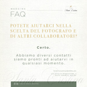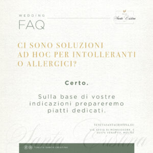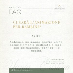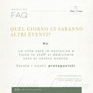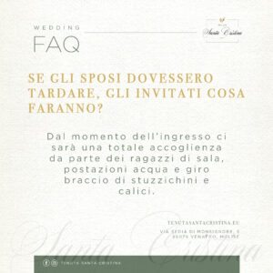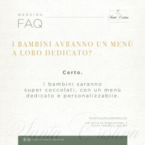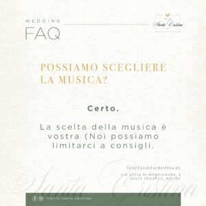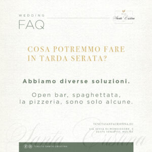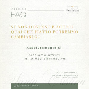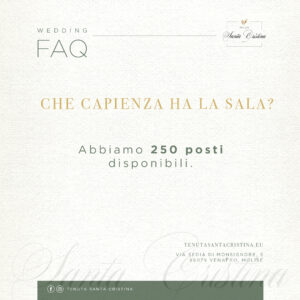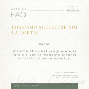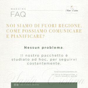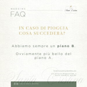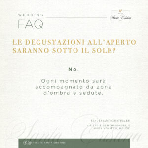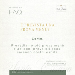 L’idea è della Tenuta Santa Cristina, che sui propri canali social, ha diffuso un vero e proprio “mazzo” digitale di carte, contenenti domande e risposte sull’organizzazione del “giorno più bello”. Una sorta di vere e proprie FAQ (Frequently Asked Question) per informare le coppie su come la struttura intende il proprio concept di evento matrimoniale.