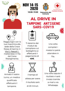 ISERNIA – Il comitato isernino della Croce Rossa Italiana, con il patrocinio del Comune di Isernia, ha organizzato, per il 14 e 15 novembre, dalle ore 10 alle ore 19, un “Drive In” per effettuare tamponi per la ricerca dell’antigene Sars-Cov19.
