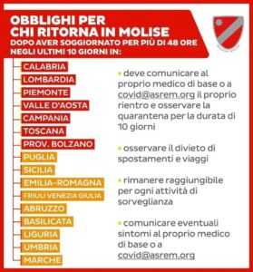 Allo stato attuale, quindi, chi rientra in Molise, dopo aver soggiornato per più di 48 ore in una di queste regioni, deve: