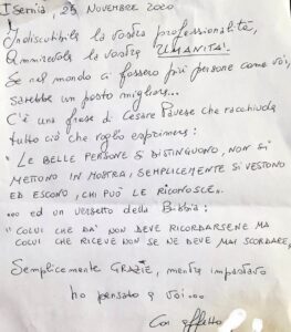 “Indiscutibile la vostra professionalità, ammirevole la vostra UMANITA’. Se nel mondo ci fossero più persone come voi, sarebbe un posto migliore… C’è una frase di Cesare Pavese che racchiude tutto ciò che voglio esprimere *Le belle persone si distinguono, non si mettono in mostra; semplicemente si vestono ed escono, chi può le riconosce*. Ed anche un versetto della Bibbia *Colui che dà non deve ricordarsene ma colui che riceve non se ne deve mai scordare*. Semplicemente GRAZIE, mentre impastavo ho pensato a voi…” – ha scritto la donna in una lettera.