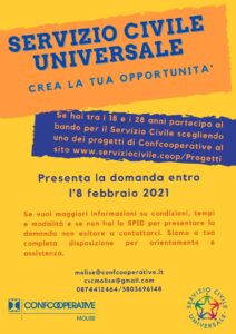 Nel programma, risultano presenti anche progetti di Confcooperative Molise – Ufficio di Servizio Civile: sinonimo di un importante successo conseguito, frutto di un considerevole ed incessante lavoro protrattosi nell’anno 2020.