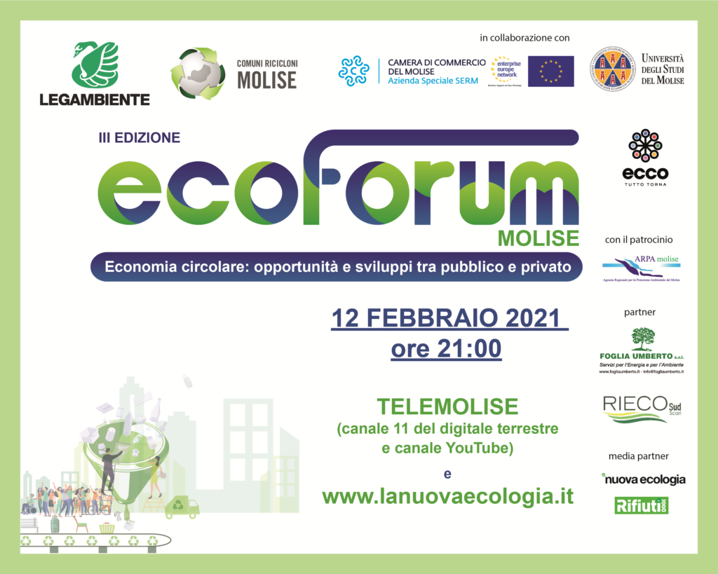 CAMPOBASSO – Anche quest’anno torna Ecoforum, l’iniziativa di Legambiente giunta alla terza edizione, organizzata in collaborazione con l’Azienda Speciale SERM della Camera di Commercio del Molise – Partner Enterprise Europe Network e l’Università degli Studi del Molise, con l’obiettivo di sensibilizzare ed informare i cittadini rispetto ai temi dell’economia circolare e della raccolta differenziata.